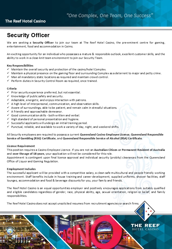 The Reef Hotel Casino acknowledges the Gimuy, Walubara and Yidinji people, the traditional custodians of the land where we live, learn and work on, and pay respects to elders past, present and emerging.