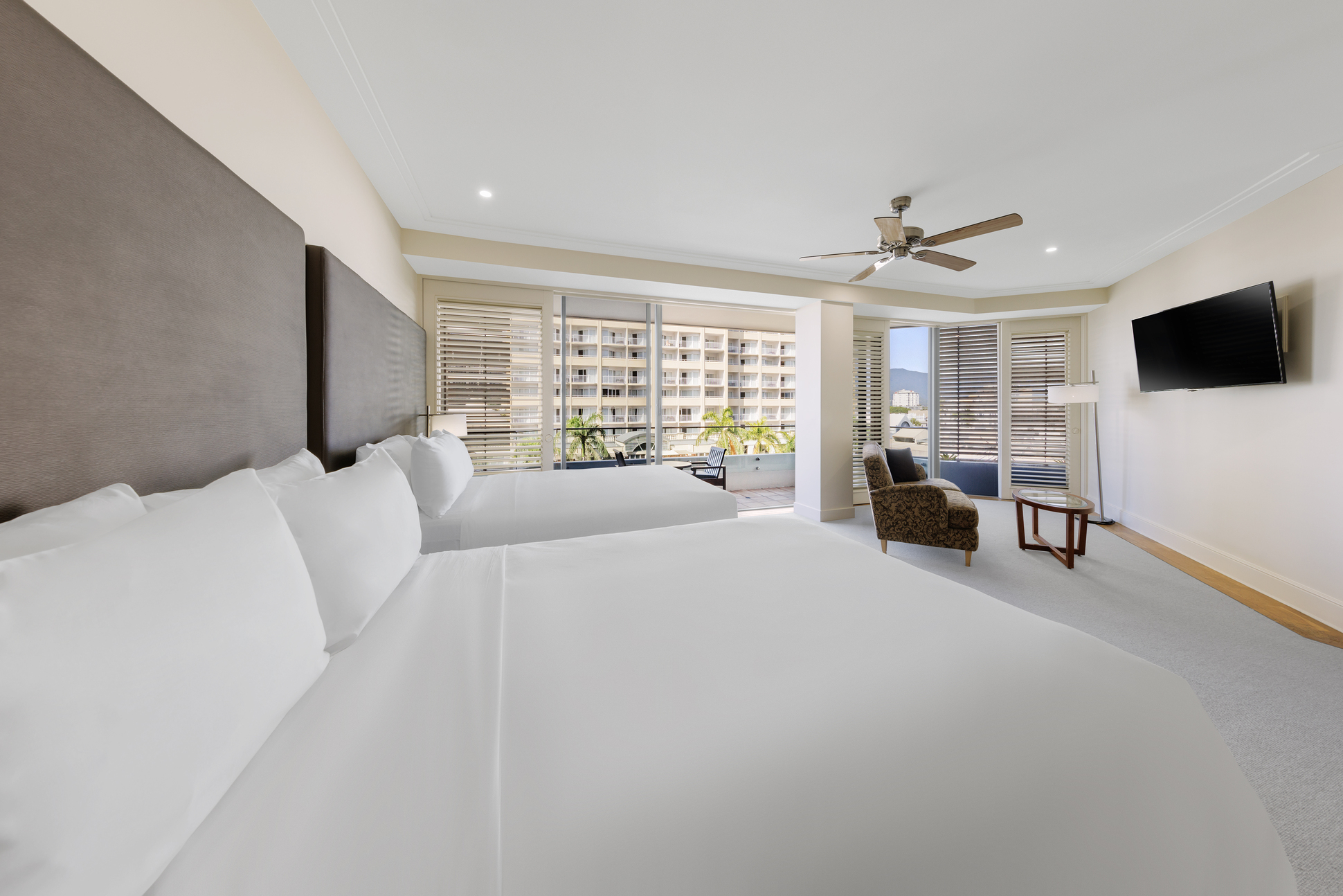 With an abundance of natural light, the luxurious Junior Suite features open outlooks of Cairns city. The spacious suite room features two double beds.