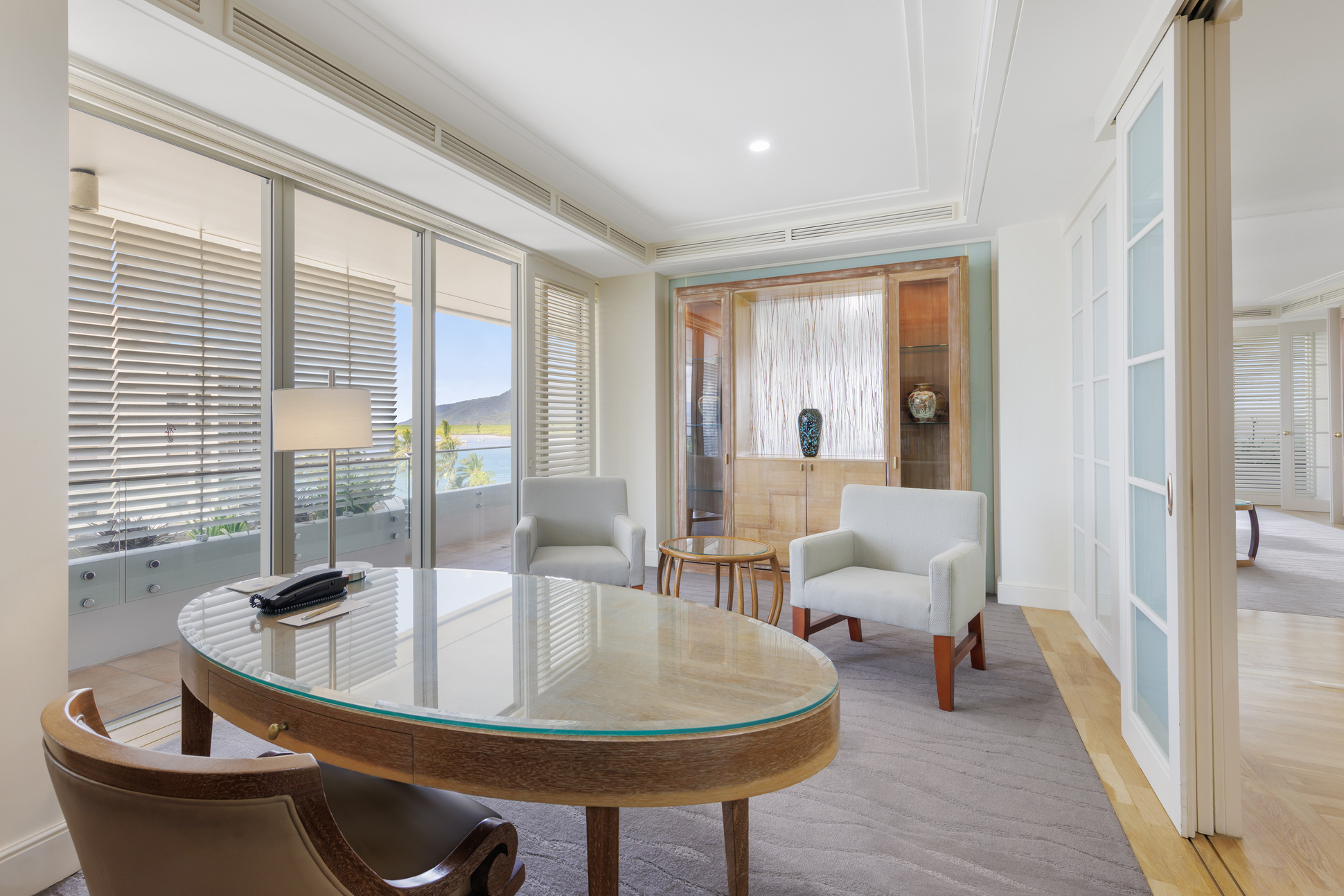 The Presidential Suite is designed for supreme comfort, functionality and privacy and is comprised of a spacious sitting area, separate dining room that seats up to 8 with an adjoining fully self contained kitchen, office/study, bedroom with four poster king bed, guest powder room, main bathroom with oversized spa and separate shower, walk through wardrobe, interconnecting accommodation with a Deluxe Room and private butler entrance. Elegance is enhanced with small touches of original artwork, day lounges and decadent amenities. Maximum capacity is 3 people with the use of a rollaway.